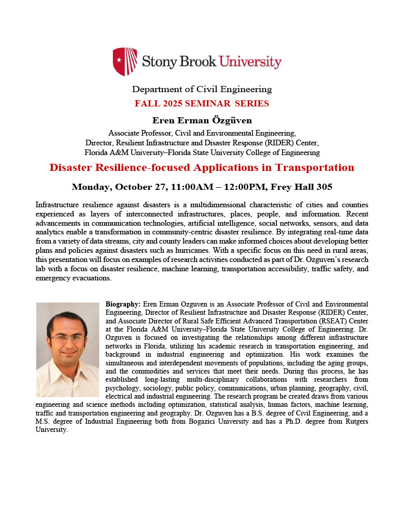 "Disaster Resilience-focused Applications in Transportation", Eren Erman Özgüven, PhD
