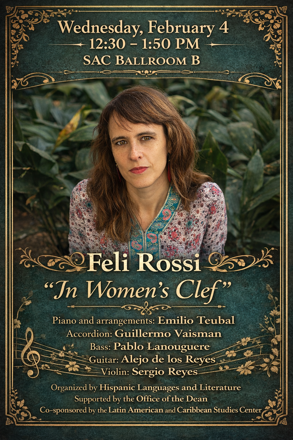 Feb 4 Live Latin American Mucic: Feli Rossi "in Women's Clef." Join us for a lively Latin American band performance celebrating culture, music, and