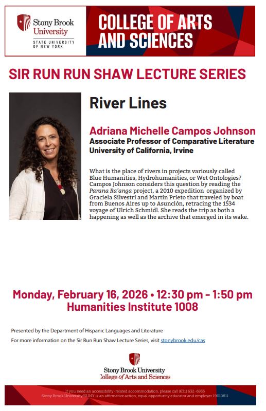Feb 16 Sir Run Run Shaw Lecture Series. Adriana Michele Campos Johnson (UC Irvine), "River Lines." Monday Feb 16th 12.30 to 1.50 pm in Humanities 1008. Organized by Prof. Javier Uriarte. See poster.