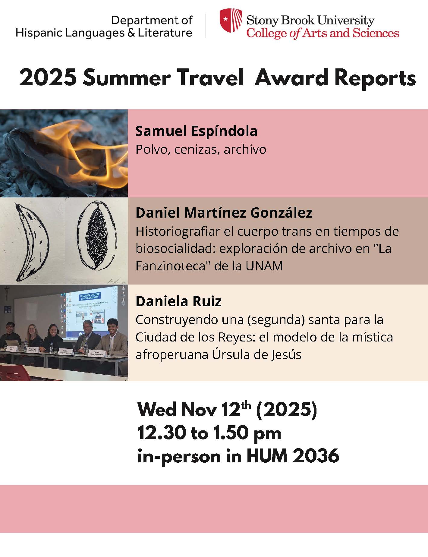 Nov 12 2025 Summer Travel Award Reports (PhD Students): Samuel Espíndola, Daniel Martínez González and Daniela Ruiz. Wed Nov 12 from 12.30 to 1.50 pm in HUM 2026. See poster.