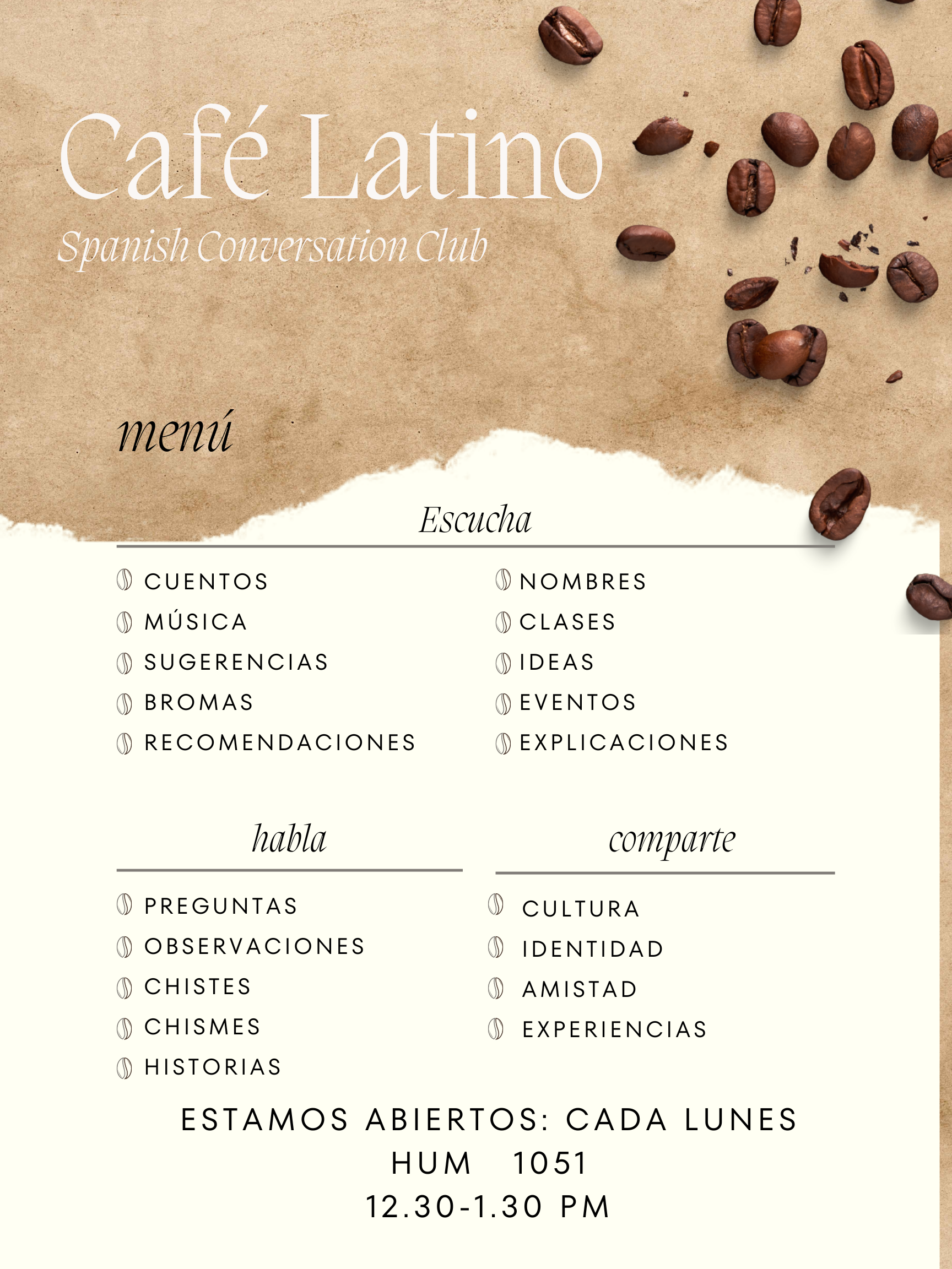Teatro Abierto, our Spanish theater group, directed by Prof. Zaida Corniel, will share space and time with the Café Latino.